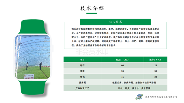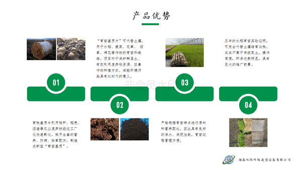 本產品針對水稻旱育苗大量挖取耕層土,耕層破壞嚴峻的現(xiàn)實,利用秸稈、蘑菇菌糠、稻殼、沼渣等農林廢棄物經過工廠化快速熟化,賦予全套的營養(yǎng)、防病、除草配方,制造成新型的嶄新的“無土育苗基質”。