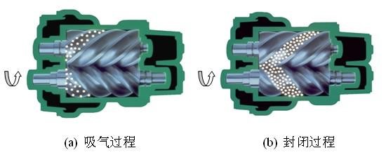 螺桿式空氣壓縮機(jī)的工作原理:電機(jī)驅(qū)動(dòng)轉(zhuǎn)子,主從轉(zhuǎn)子的齒溝空間在轉(zhuǎn)至進(jìn)氣端壁開口時(shí),其空間大,外界的空氣充滿其中,當(dāng)轉(zhuǎn)子的進(jìn)氣側(cè)端面轉(zhuǎn)離了殼之進(jìn)氣口時(shí),在齒溝間的空氣被封閉在主、從轉(zhuǎn)子與機(jī)殼之間,完成吸氣過程。在吸氣結(jié)束時(shí),主、從轉(zhuǎn)子齒峰與機(jī)殼形成的封閉容積隨著轉(zhuǎn)子角度的變化而減少,并按螺旋狀移動(dòng),此為壓縮過程。在輸送過程中,容積不斷減少,氣體不斷被壓縮,壓力提高,溫度升高,同時(shí),因氣壓差而變成霧狀的潤滑油被噴入壓縮腔,從而達(dá)到壓縮、降低溫度密封和潤滑的作用。當(dāng)轉(zhuǎn)子之封閉齒峰旋轉(zhuǎn)到與機(jī)殼排氣口相遇時(shí),被壓縮的空氣開始排放,直到齒峰與齒溝的吻合面移至排氣端面,此時(shí)齒溝空間為零,即完成排氣過程。與此同時(shí),主從轉(zhuǎn)子的另一對齒溝已旋轉(zhuǎn)至進(jìn)氣端,形成大空間,開始吸氣過程,由此開始一個(gè)新的壓縮循環(huán)。